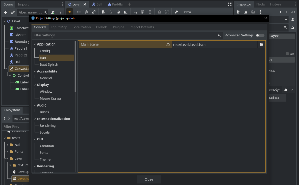node to make it big enough so it covers enough of the screen. Then pick a dark color for the background. - Instance your scenes: This is where Godot’s power shines. In the FileSystem dock (bottom-left), find your